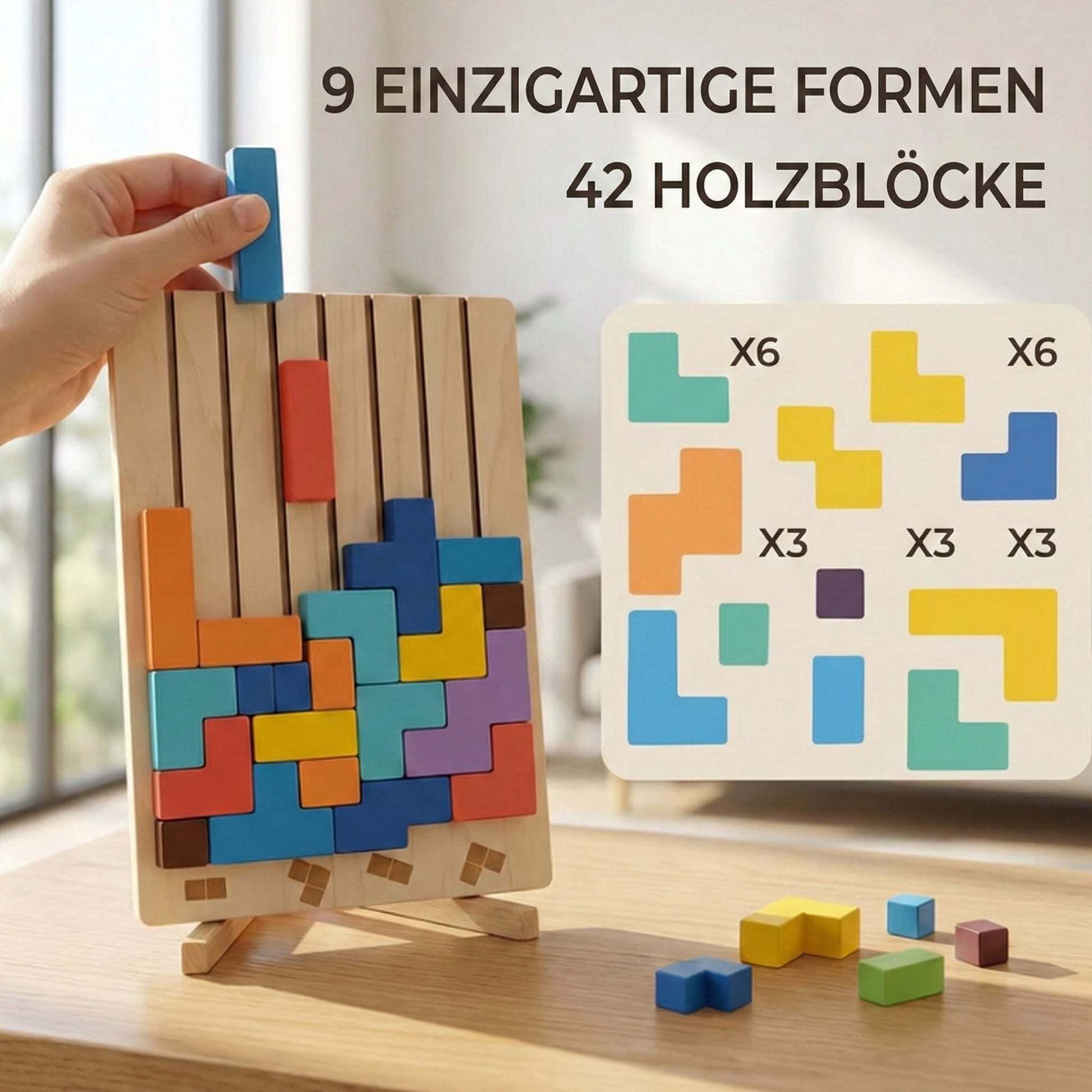 Das klassische Tetris-Prinzip fördert logisches Denken, räumliche Vorstellung und Problemlösefähigkeit. Kinder lernen, vorauszudenken, Muster zu erkennen und Lösungen zu finden – ganz ohne Bildschirm und ohne Druck.